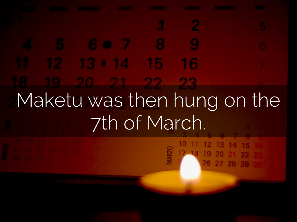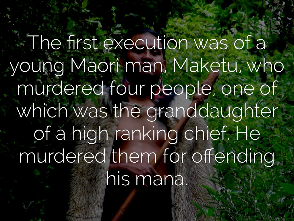 The first execution was of a young Maori man, Maketu, who murdered four people, one of which was the granddaughter of a high ranking chief. He murdered them for offending his mana.