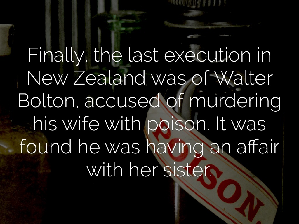 Finally, the last execution in New Zealand was of Walter Bolton, accused of murdering his wife with poison. It was found he was having an affair with her sister.