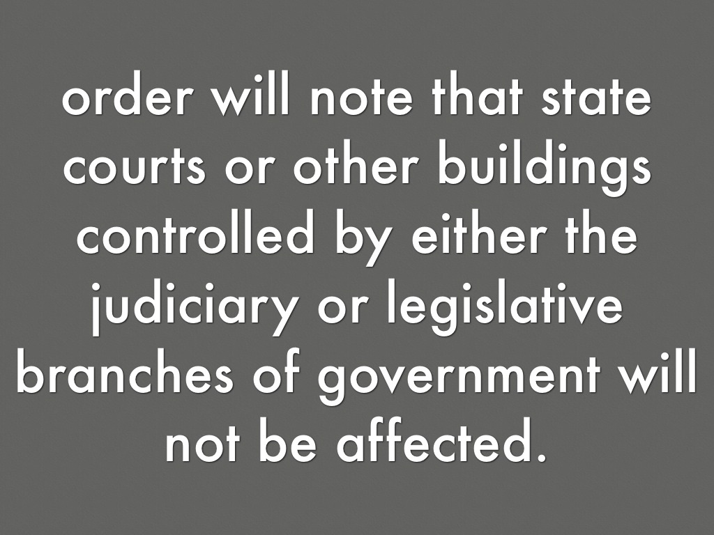 order will note that state courts or other buildings controlled by either the judiciary or legislative branches of government will not be affected.