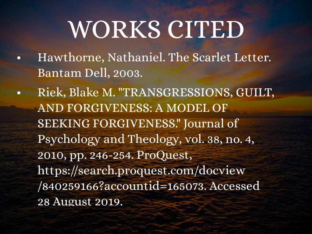 Riek, Blake M. "TRANSGRESSIONS, GUILT, AND FORGIVENESS: A MODEL OF SEEKING FORGIVENESS." Journal of Psychology and Theology, vol. 38, no. 4, 2010, pp. 246-254. ProQuest, https://search.proquest.com/docview/840259166?accountid=165073. Accessed 28 August 2019.