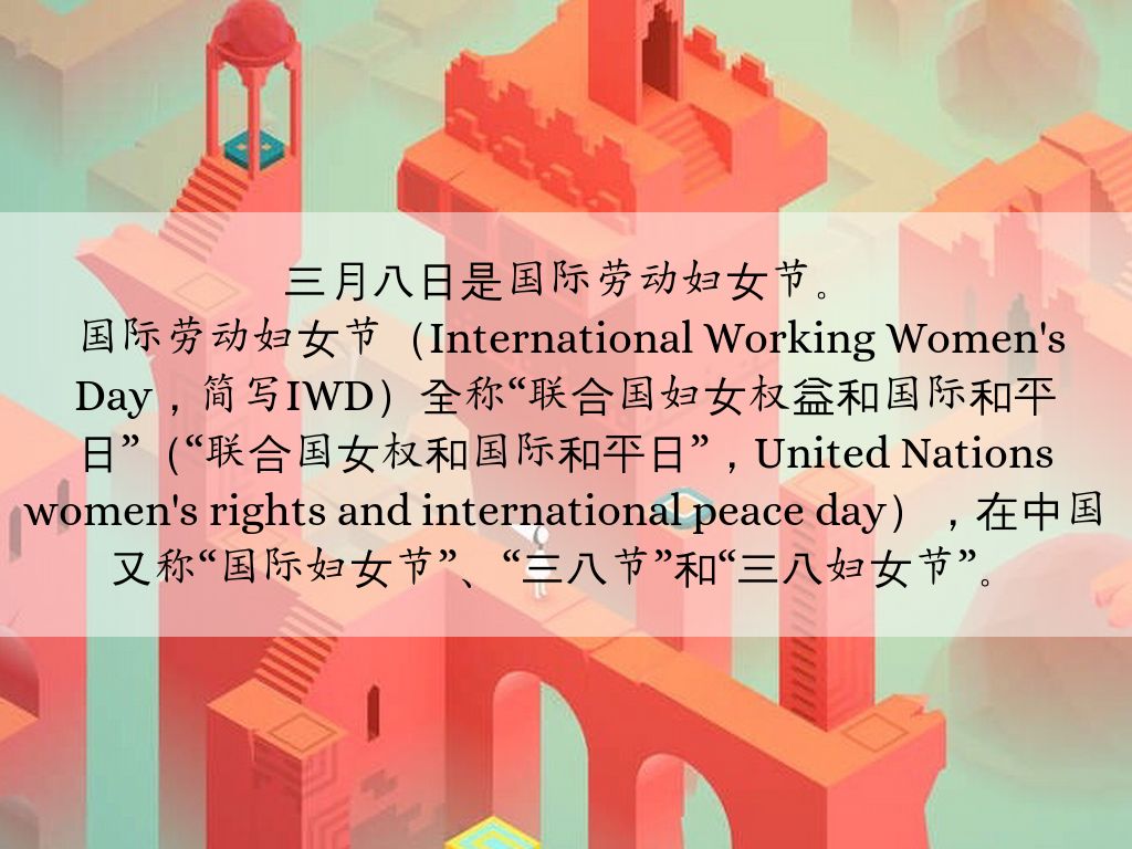 国际劳动妇女节(International Working Women's Day,简写IWD)全称“联合国妇女权益和国际和平日”(“联合国女权和国际和平日”,United Nations women's rights and international peace day),在中国又称“国际妇女节”、“三八节”和“三八妇女节”。