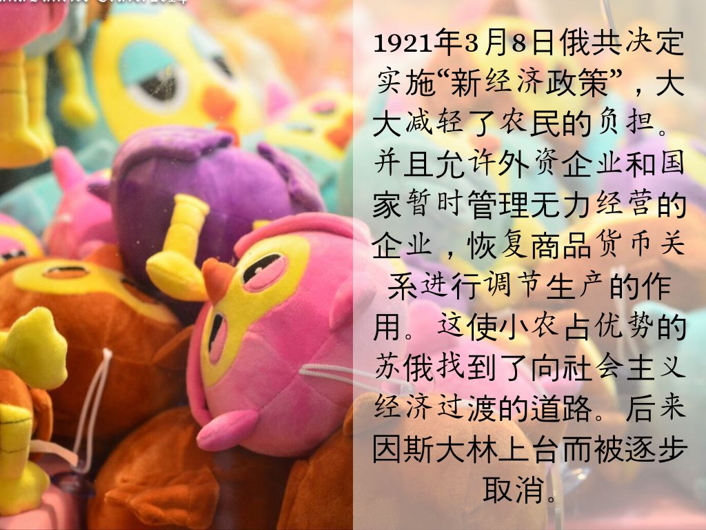 1921年3月8日俄共决定实施“新经济政策”,大大减轻了农民的负担。并且允许外资企业和国家暂时管理无力经营的企业,恢复商品货币关系进行调节生产的作用。这使小农占优势的苏俄找到了向社会主义经济过渡的道路。后来因斯大林上台而被逐步取消。
