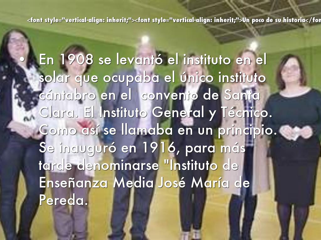 En 1908 se levantó el instituto en el solar que ocupaba el único instituto cántabro en el convento de Santa Clara. El Instituto General y Técnico. Como así se llamaba en un principio. Se inauguró en 1916, para más tarde denominarse "Instituto de Enseñanza Media José María de Pereda.