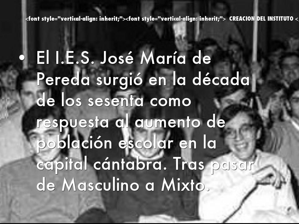 El I.E.S. José María de Pereda surgió en la década de los sesenta como respuesta al aumento de población escolar en la capital cántabra. Tras pasar de Masculino a Mixto.