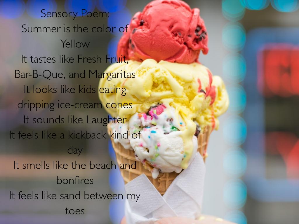 Sensory Poem: Summer is the color of Yellow It tastes like Fresh Fruit, Bar-B-Que, and Margaritas It looks like kids eating dripping ice-cream cones It sounds like Laughter It feels like a kickback kind of day It smells like the beach and bonfires It feels like sand between my toes