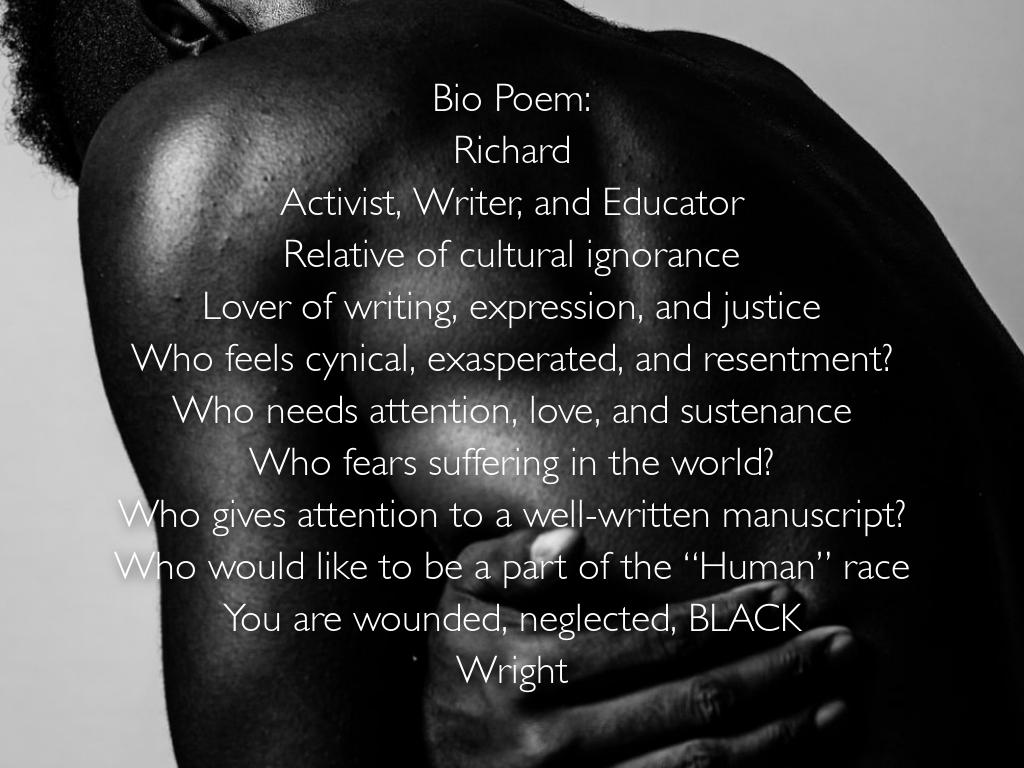 Bio Poem: Richard Activist, Writer, and Educator Relative of cultural ignorance Lover of writing, expression, and justice Who feels cynical, exasperated, and resentment? Who needs attention, love, and sustenance Who fears suffering in the world? Who gives attention to a well-written manuscript? Who would like to be a part of the “Human” race You are wounded, neglected, BLACK Wright