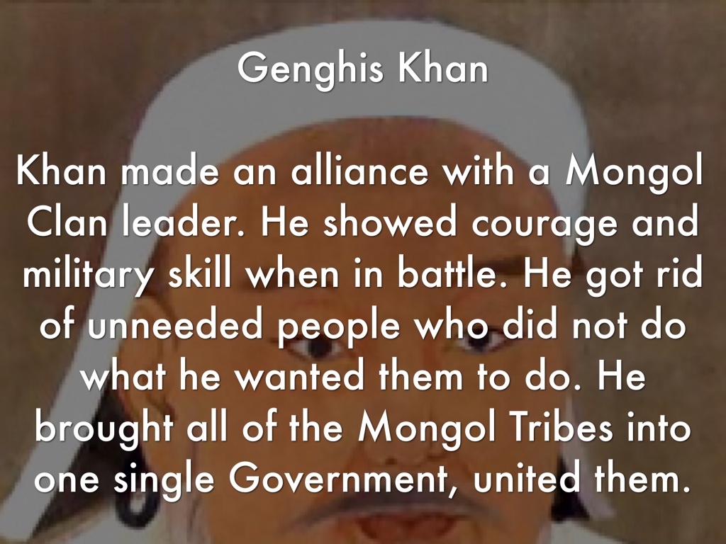 Khan made an alliance with a Mongol Clan leader. He showed courage and military skill when in battle. He got rid of unneeded people who did not do what he wanted them to do. He brought all of the Mongol Tribes into one single Government, united them.