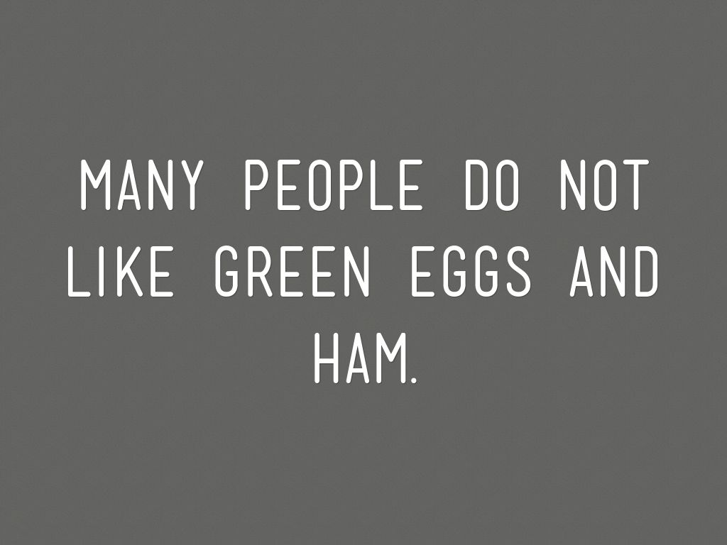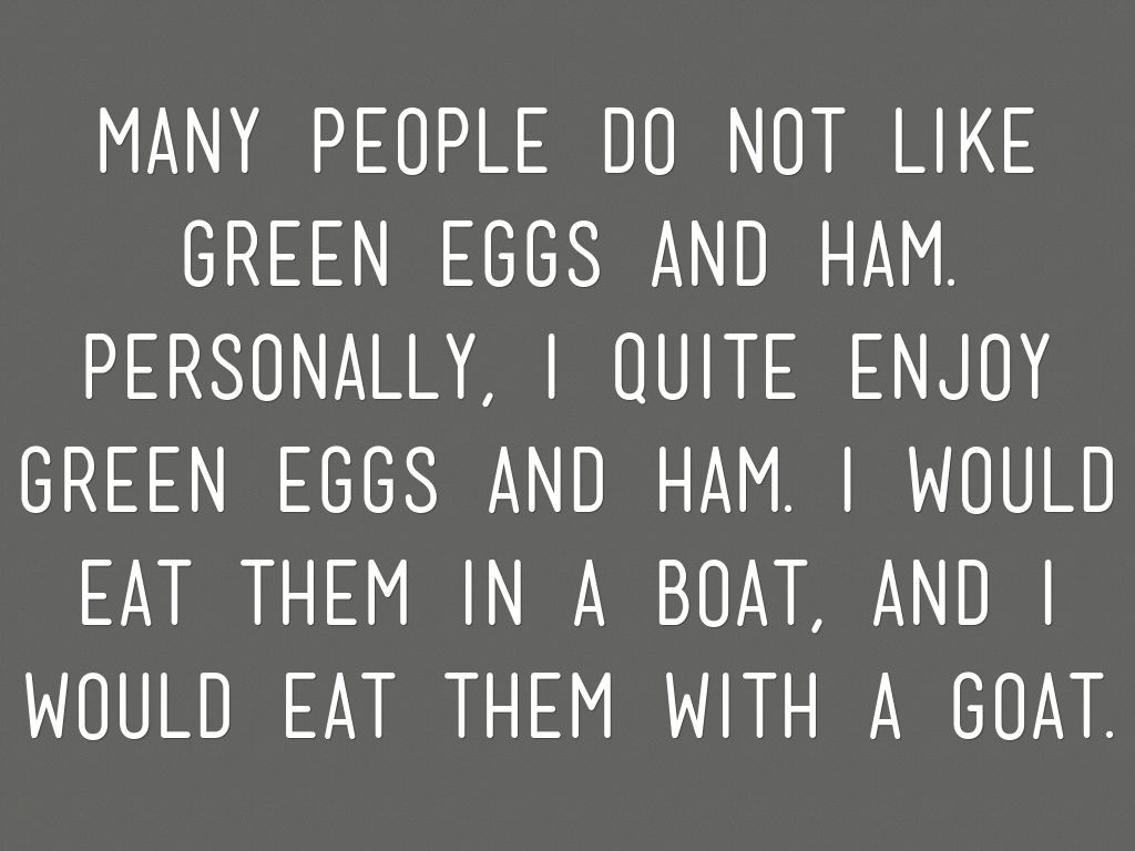 Many people do not like green eggs and ham. Personally, I quite enjoy green eggs and ham. I would eat them in a boat, and I would eat them with a goat.