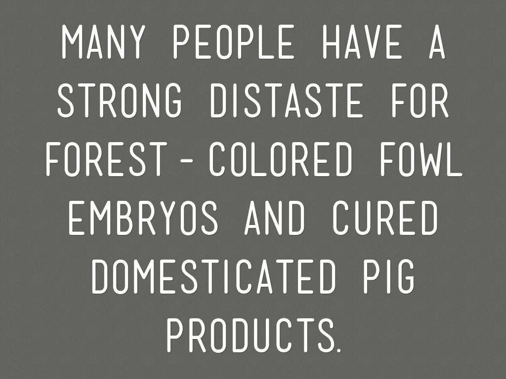 Many people have a strong distaste for forest-colored fowl embryos and cured domesticated pig products.