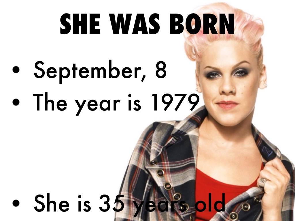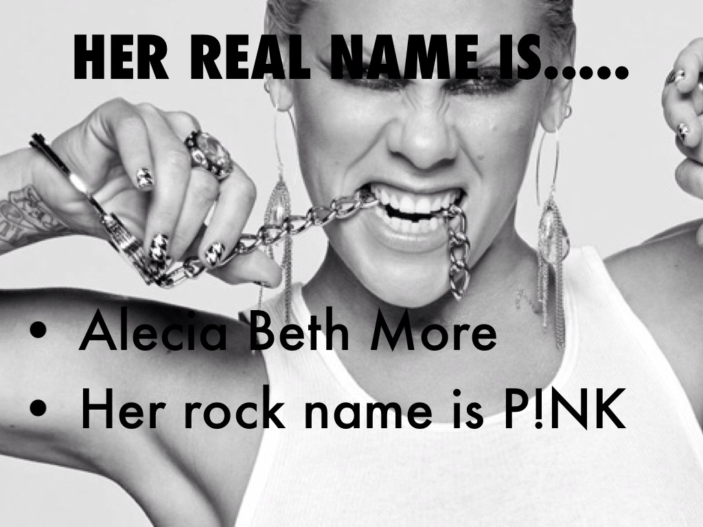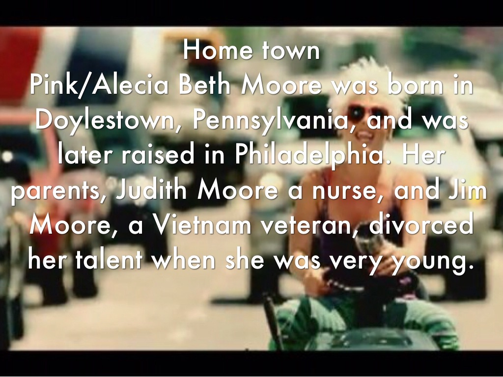 Pink/Alecia Beth Moore was born in Doylestown, Pennsylvania, and was later raised in Philadelphia. Her parents, Judith Moore a nurse, and Jim Moore, a Vietnam veteran, divorced her talent when she was very young.