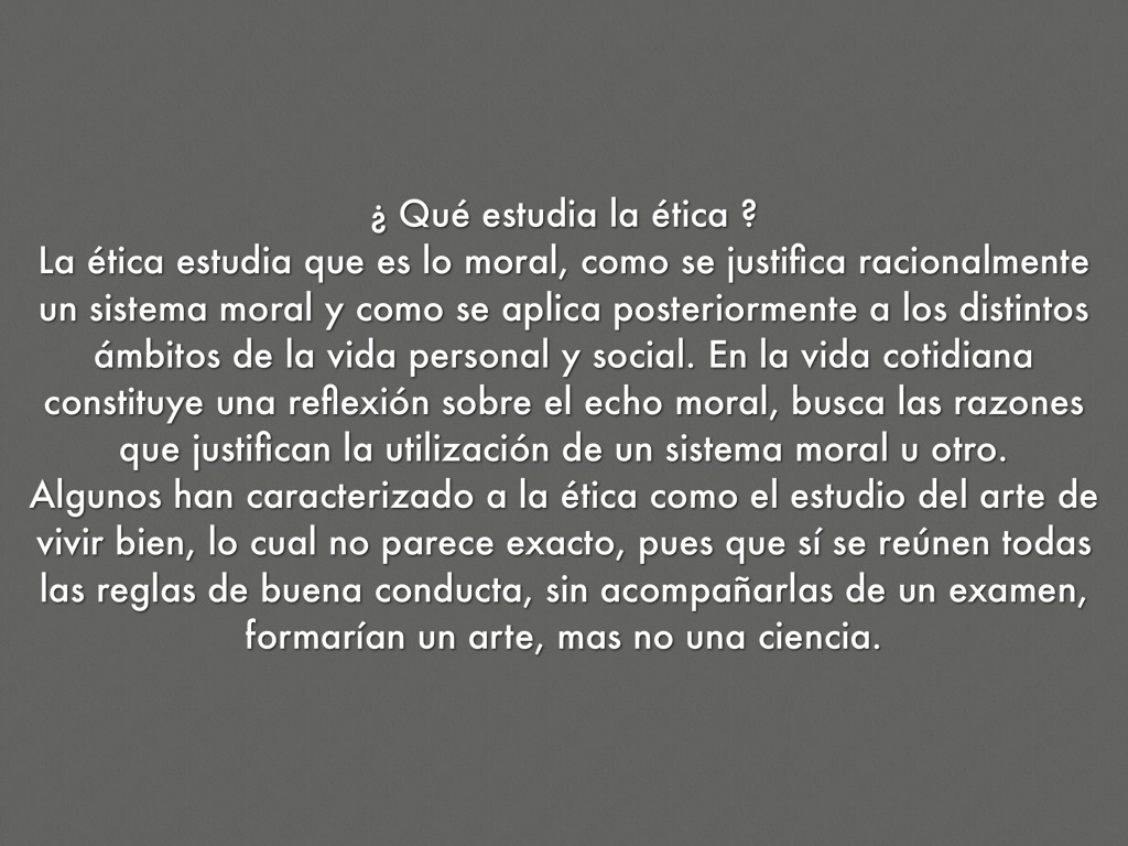 La ética estudia que es lo moral, como se justifica racionalmente un sistema moral y como se aplica posteriormente a los distintos ámbitos de la vida personal y social. En la vida cotidiana constituye una reflexión sobre el echo moral, busca las razones que justifican la utilización de un sistema moral u otro.