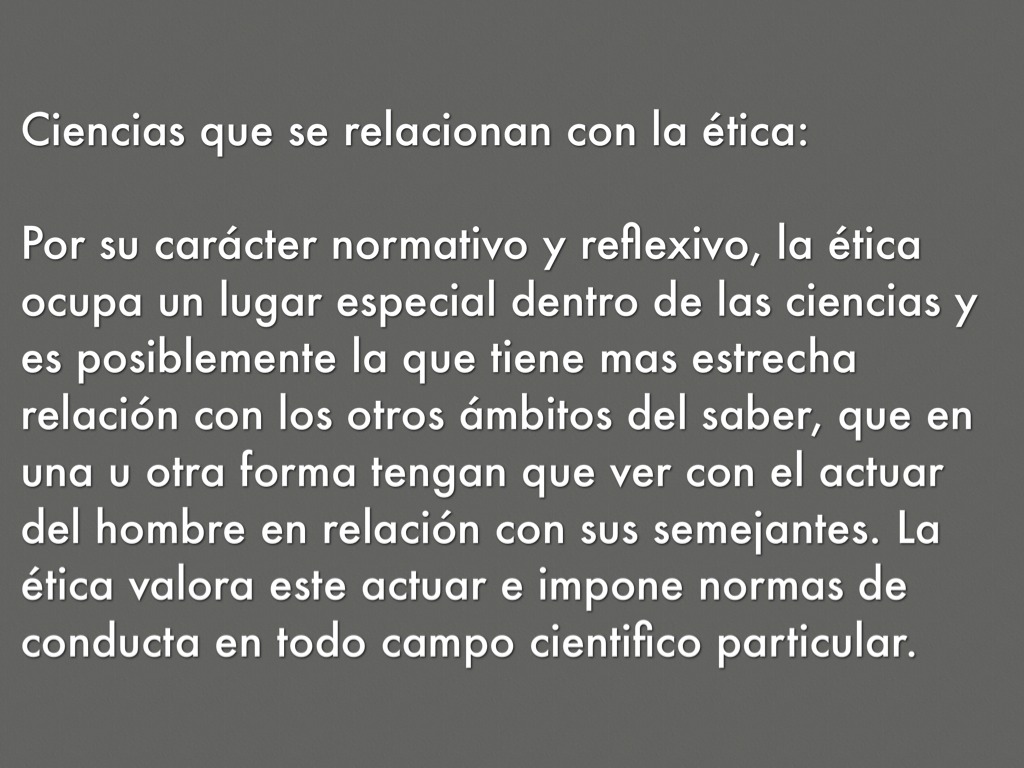 Por su carácter normativo y reflexivo, la ética ocupa un lugar especial dentro de las ciencias y es posiblemente la que tiene mas estrecha relación con los otros ámbitos del saber, que en una u otra forma tengan que ver con el actuar del hombre en relación con sus semejantes. La ética valora este actuar e impone normas de conducta en todo campo cientifico particular.