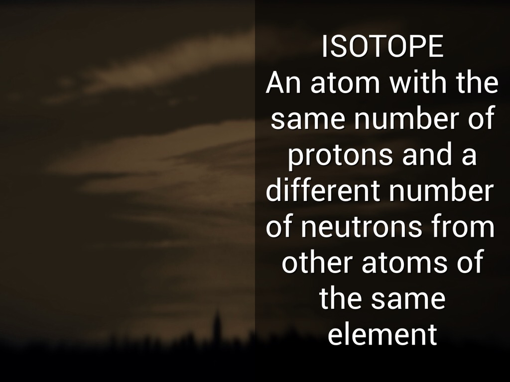 An atom with the same number of protons and a different number of neutrons from other atoms of the same element