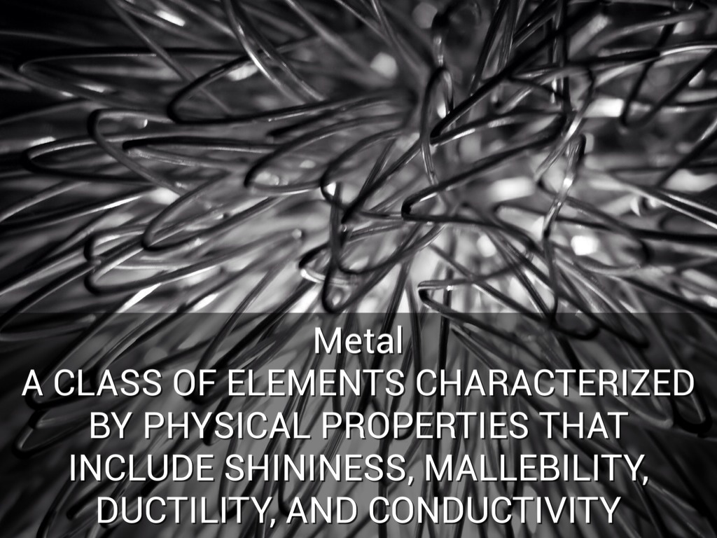 A CLASS OF ELEMENTS CHARACTERIZED BY PHYSICAL PROPERTIES THAT INCLUDE SHININESS, MALLEBILITY, DUCTILITY, AND CONDUCTIVITY