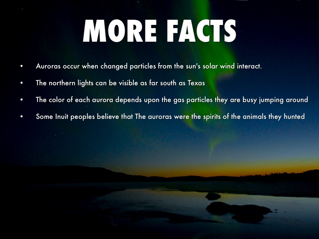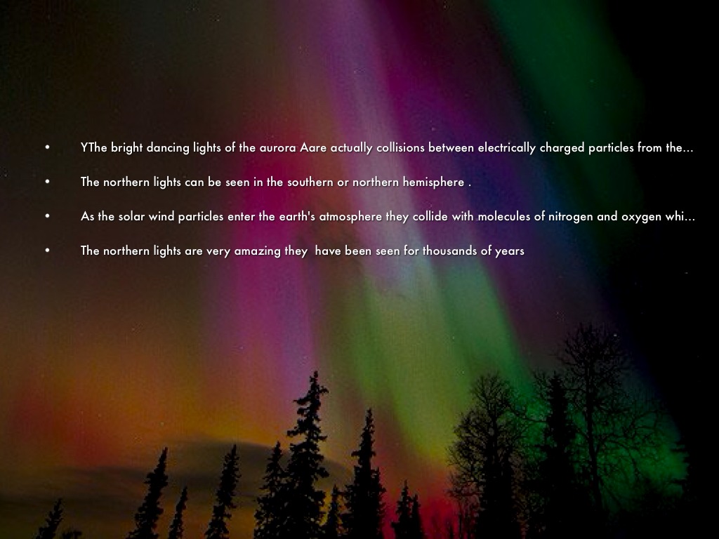 YThe bright dancing lights of the aurora Aare actually collisions between electrically charged particles from the sun that enter the earth's atmosphere.