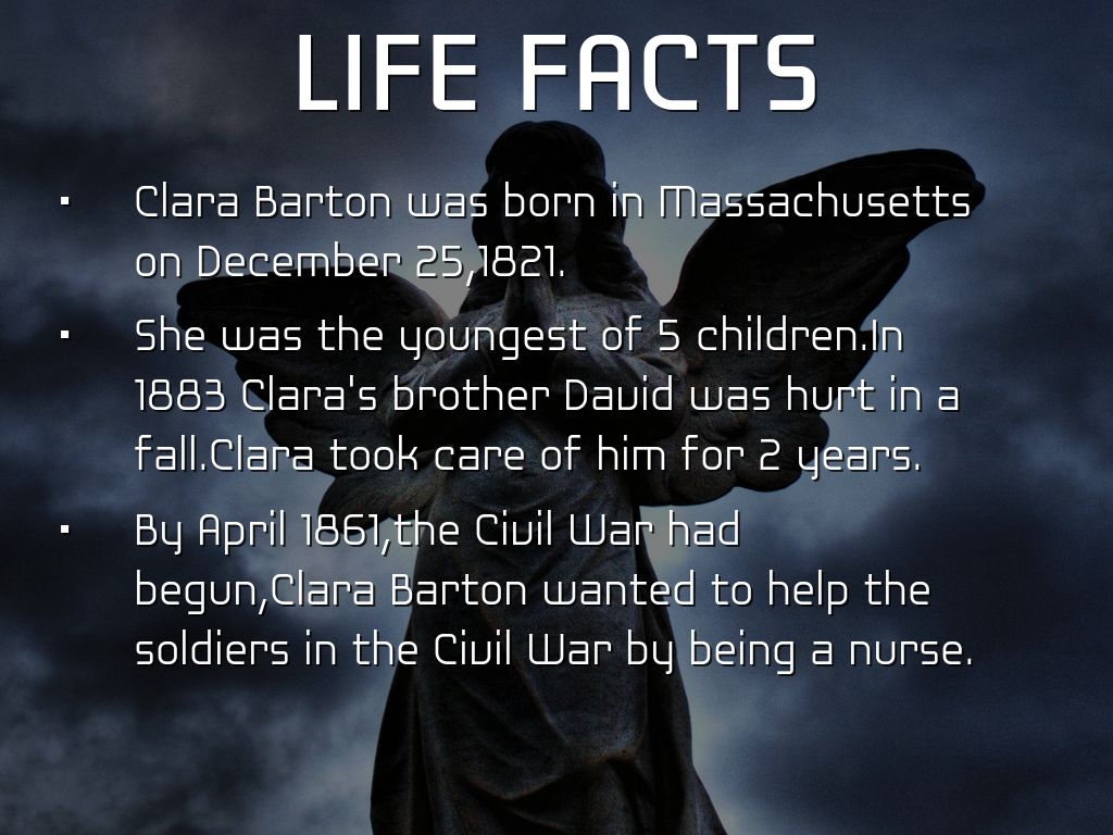 By April 1861,the Civil War had begun,Clara Barton wanted to help the soldiers in the Civil War by being a nurse.