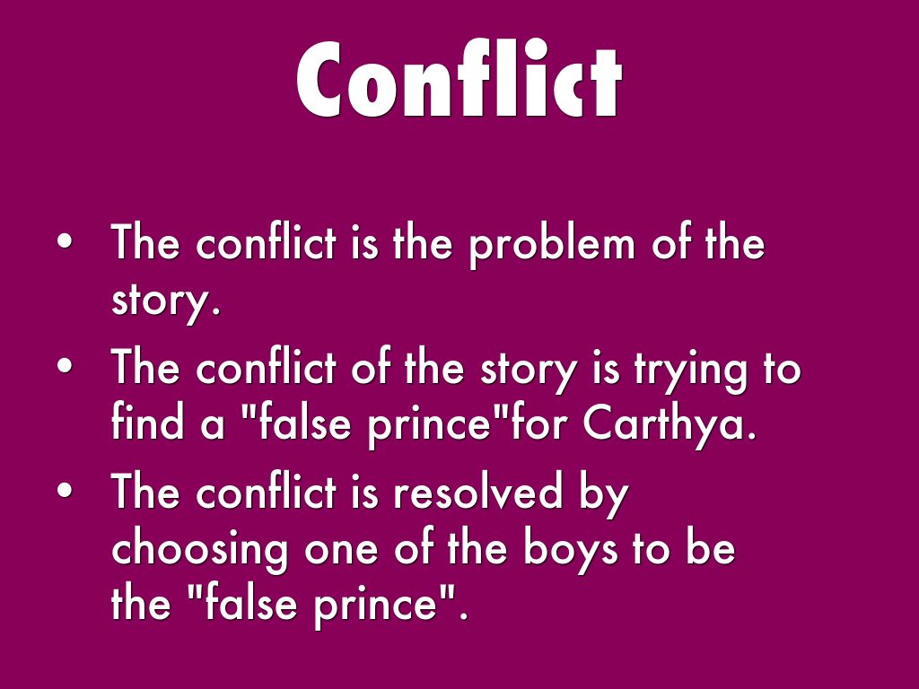 The conflict of the story is trying to find a "false prince"for Carthya.