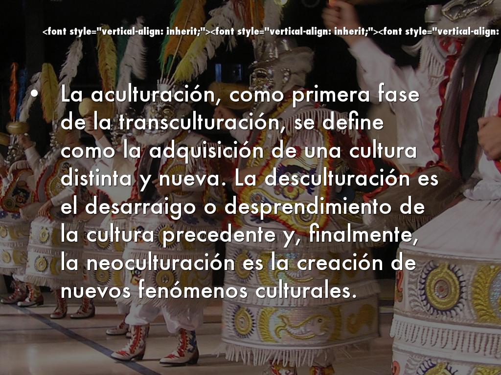 La aculturación, como primera fase de la transculturación, se define como la adquisición de una cultura distinta y nueva. La desculturación es el desarraigo o desprendimiento de la cultura precedente y, finalmente, la neoculturación es la creación de nuevos fenómenos culturales.
