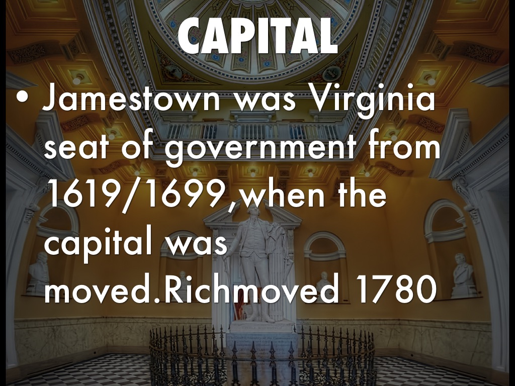 • Jamestown was Virginia seat of government from 1619/1699,when the capital was moved.Richmoved 1780