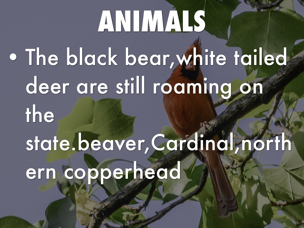 • The black bear,white tailed deer are still roaming on the state.beaver,Cardinal,northern copperhead