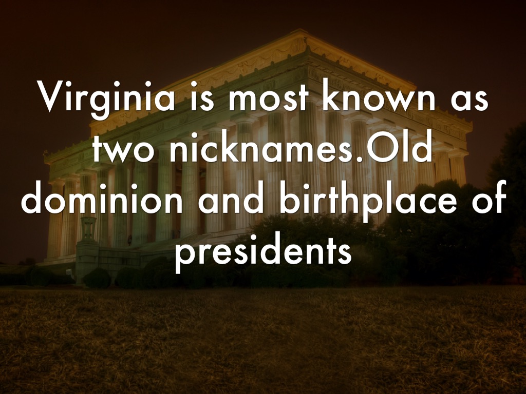 Virginia is most known as two nicknames.Old dominion and birthplace of presidents