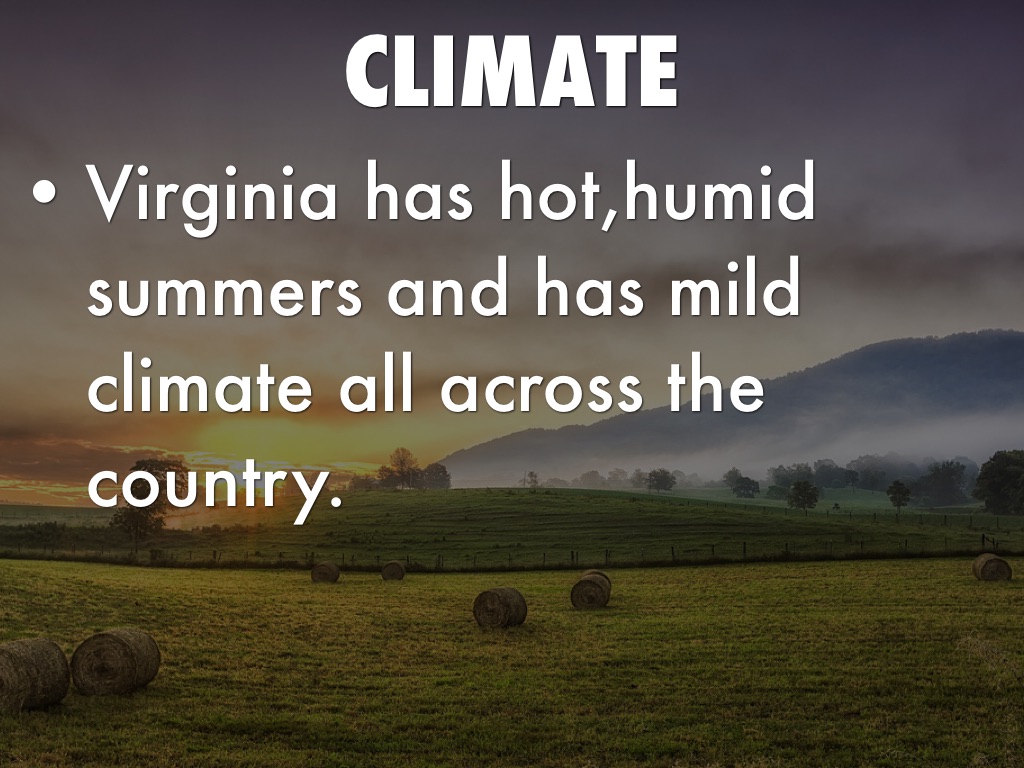 • Virginia has hot,humid summers and has mild climate all across the country.