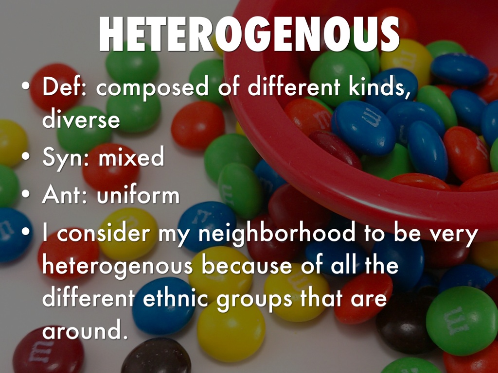I consider my neighborhood to be very heterogenous because of all the different ethnic groups that are around.
