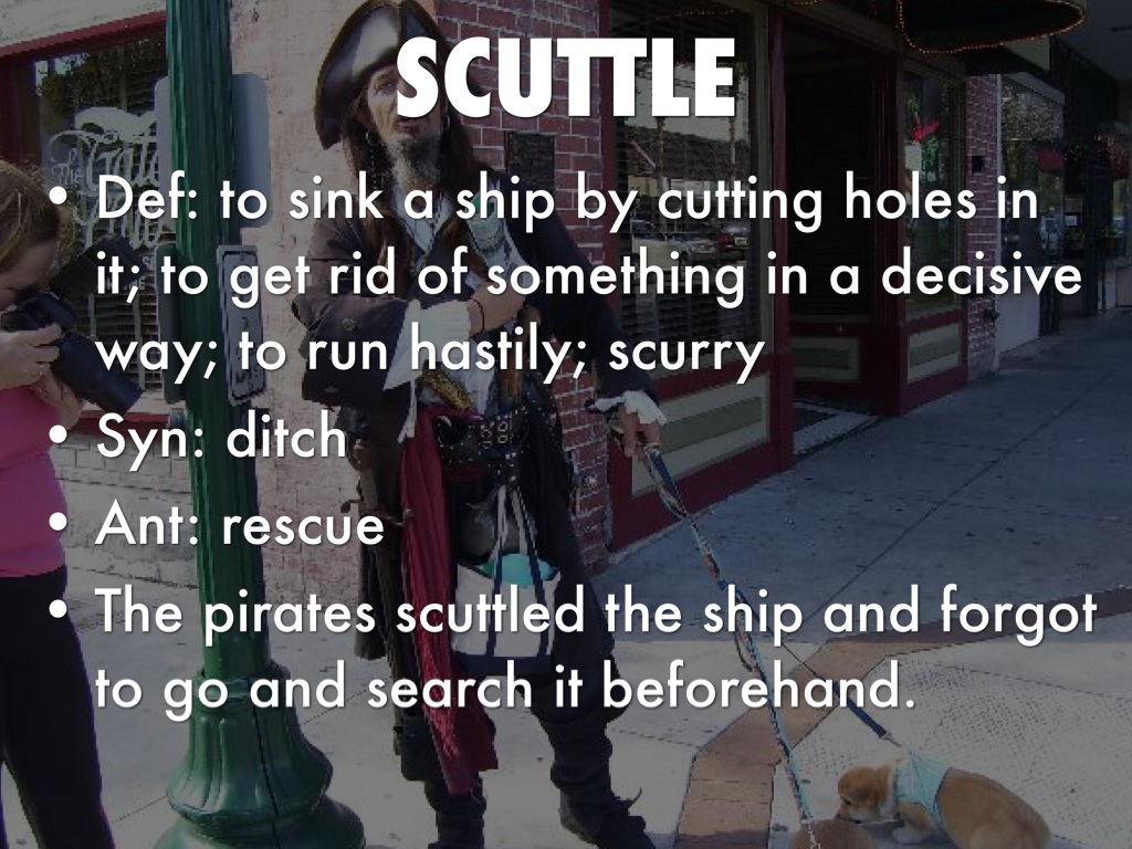Def: to sink a ship by cutting holes in it; to get rid of something in a decisive way; to run hastily; scurry