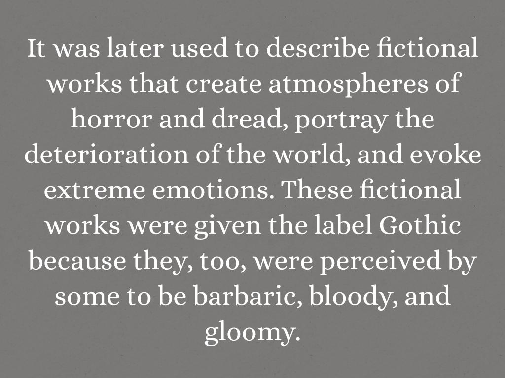 It was later used to describe fictional works that create atmospheres of horror and dread, portray the deterioration of the world, and evoke extreme emotions. These fictional works were given the label Gothic because they, too, were perceived by some to be barbaric, bloody, and gloomy.