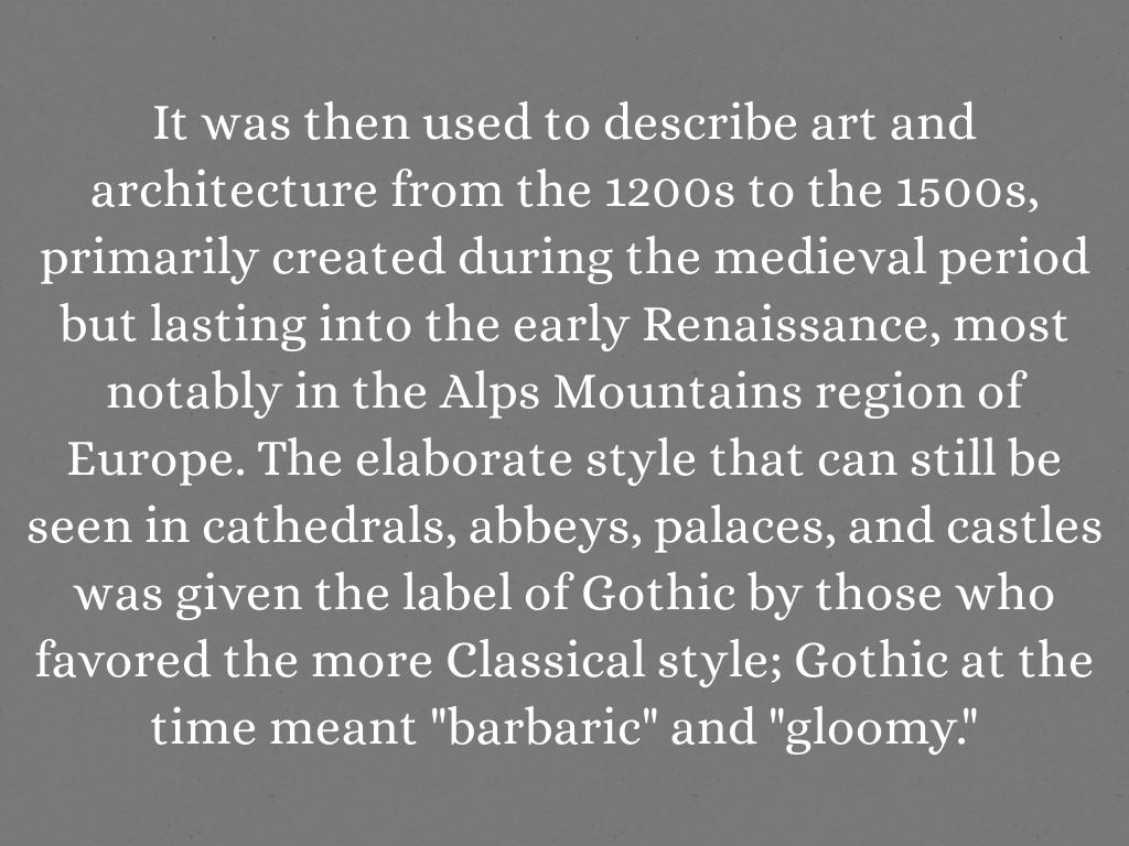 It was then used to describe art and architecture from the 1200s to the 1500s, primarily created during the medieval period but lasting into the early Renaissance, most notably in the Alps Mountains region of Europe. The elaborate style that can still be seen in cathedrals, abbeys, palaces, and castles was given the label of Gothic by those who favored the more Classical style; Gothic at the time meant "barbaric" and "gloomy."
