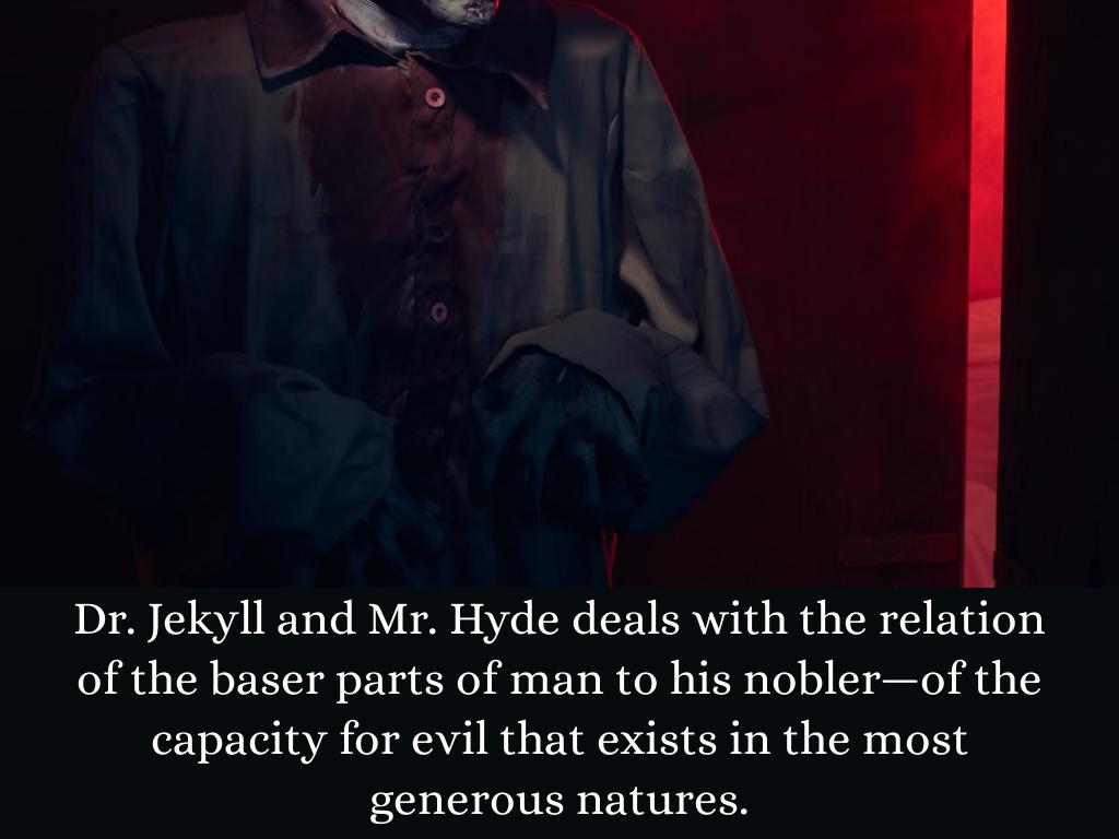 Dr. Jekyll and Mr. Hyde deals with the relation of the baser parts of man to his nobler—of the capacity for evil that exists in the most generous natures.