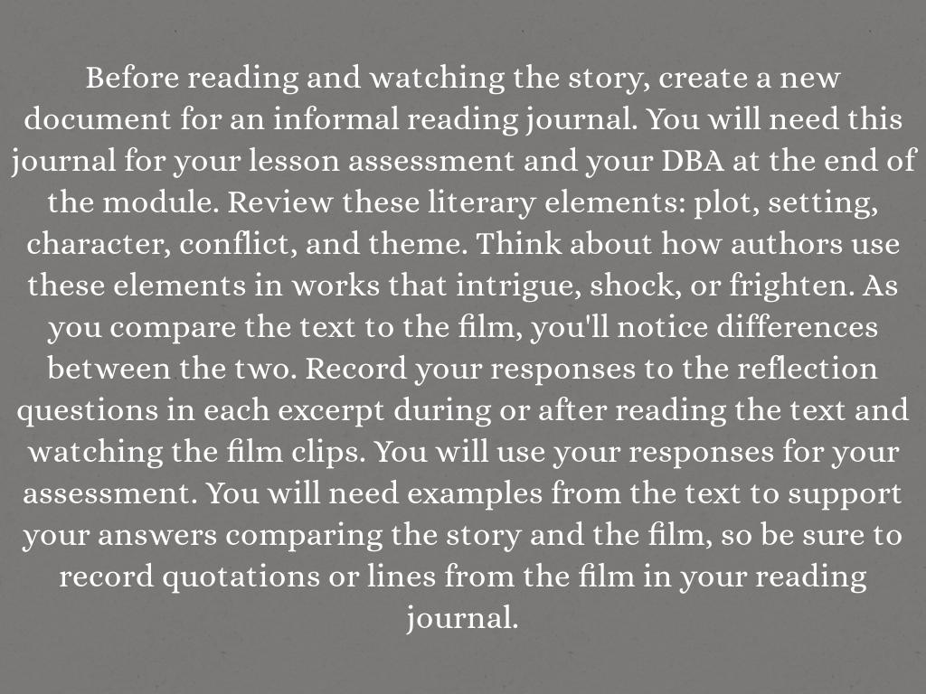 Before reading and watching the story, create a new document for an informal reading journal. You will need this journal for your lesson assessment and your DBA at the end of the module. Review these literary elements: plot, setting, character, conflict, and theme. Think about how authors use these elements in works that intrigue, shock, or frighten. As you compare the text to the film, you'll notice differences between the two. Record your responses to the reflection questions in each excerpt during or after reading the text and watching the film clips. You will use your responses for your assessment. You will need examples from the text to support your answers comparing the story and the film, so be sure to record quotations or lines from the film in your reading journal.