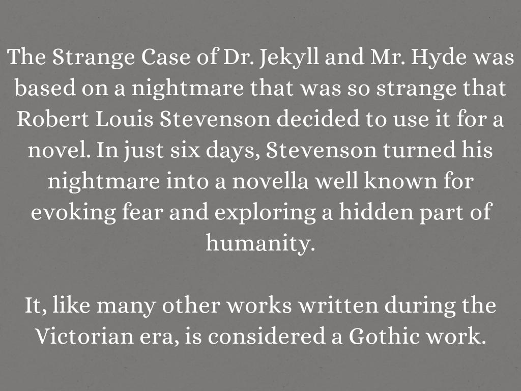 The Strange Case of Dr. Jekyll and Mr. Hyde was based on a nightmare that was so strange that Robert Louis Stevenson decided to use it for a novel. In just six days, Stevenson turned his nightmare into a novella well known for evoking fear and exploring a hidden part of humanity.