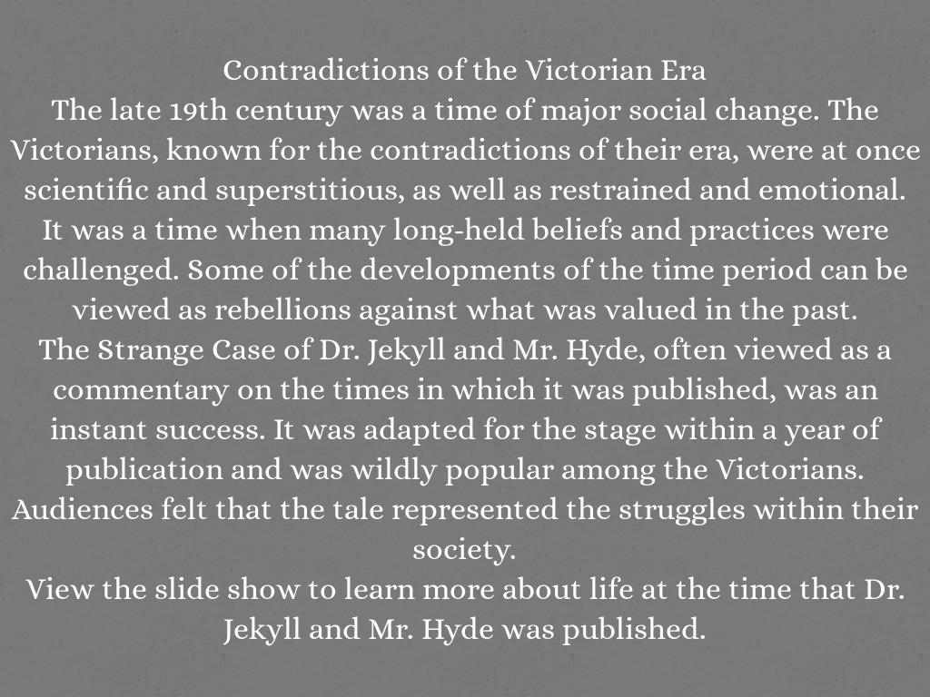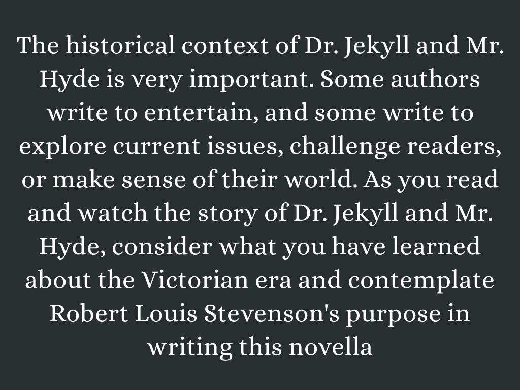 The historical context of Dr. Jekyll and Mr. Hyde is very important. Some authors write to entertain, and some write to explore current issues, challenge readers, or make sense of their world. As you read and watch the story of Dr. Jekyll and Mr. Hyde, consider what you have learned about the Victorian era and contemplate Robert Louis Stevenson's purpose in writing this novella