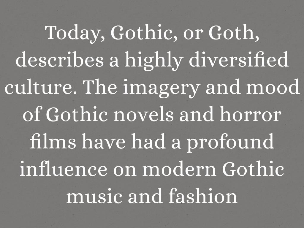 Today, Gothic, or Goth, describes a highly diversified culture. The imagery and mood of Gothic novels and horror films have had a profound influence on modern Gothic music and fashion.