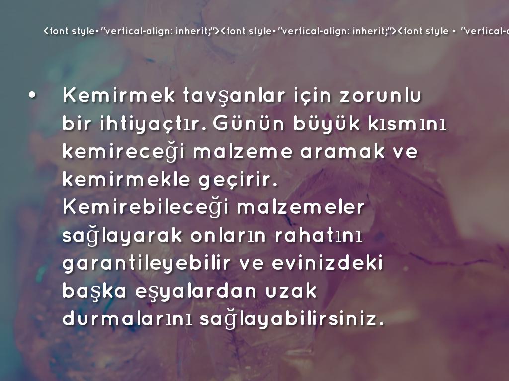 Kemirmek tavşanlar için zorunlu bir ihtiyaçtır. Günün büyük kısmını kemireceği malzeme aramak ve kemirmekle geçirir. Kemirebileceği malzemeler sağlayarak onların rahatını garantileyebilir ve evinizdeki başka eşyalardan uzak durmalarını sağlayabilirsiniz.