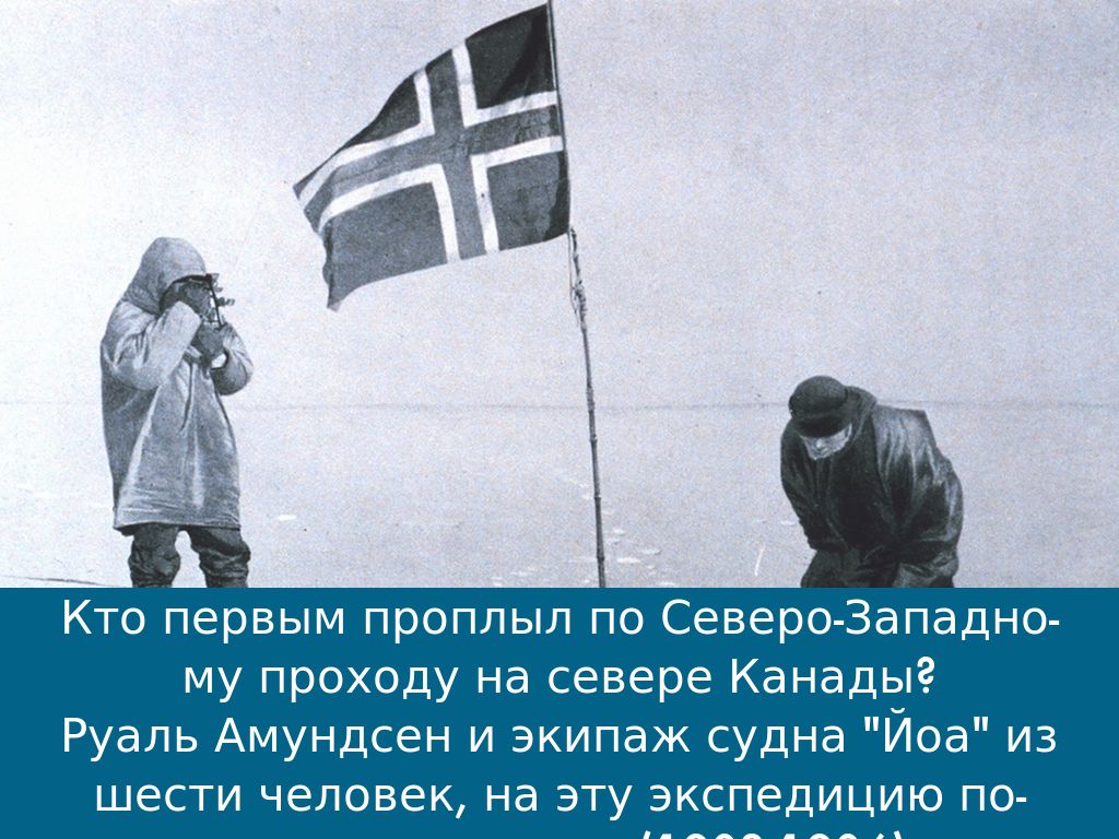 Кто первым проплыл по Северо-Западному проходу на севере Канады? Руаль Амундсен и экипаж судна "Йоа" из шести человек, на эту экспедицию потратили три года (1903-1906).