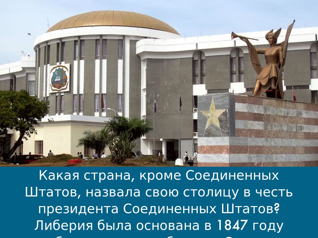 Какая страна, кроме Соединенных Штатов, назвала свою столицу в честь президента Соединенных Штатов? Либерия была основана в 1847 году освобожденными рабами из Соединенных Штатов.