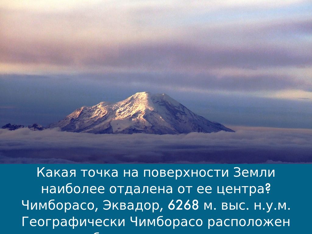 Какая точка на поверхности Земли наиболее отдалена от ее центра? Чимборасо, Эквадор, 6268 м. выс. н.у.м. Географически Чимборасо расположен близко к экватору.