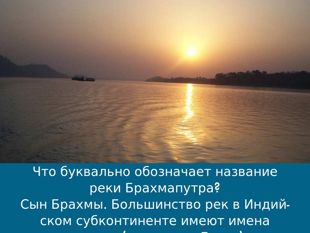 Что буквально обозначает название реки Брахмапутра? Сын Брахмы. Большинство рек в Индийском субконтиненте имеют имена женского рода (например: Ганга), но эта река носит название мужского рода.