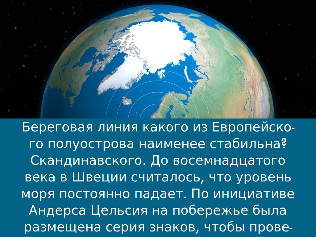 Береговая линия какого из Европейского полуострова наименее стабильна? Скандинавского. До восемнадцатого века в Швеции считалось, что уровень моря постоянно падает. По инициативе Андерса Цельсия на побережье была размещена серия знаков, чтобы проверить эту теорию.
