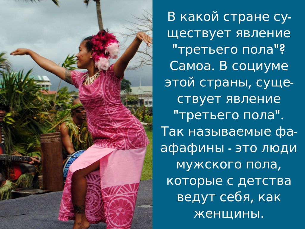 В какой стране существует явление "третьего пола"? Самоа. В социуме этой страны, существует явление "третьего пола". Так называемые фаафафины - это люди мужского пола, которые с детства ведут себя, как женщины.