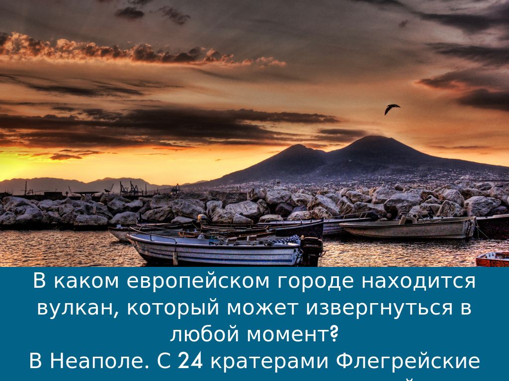В каком европейском городе находится вулкан, который может извергнуться в любой момент? В Неаполе. С 24 кратерами Флегрейские поля являются одним из крупнейших вулканов в мире.