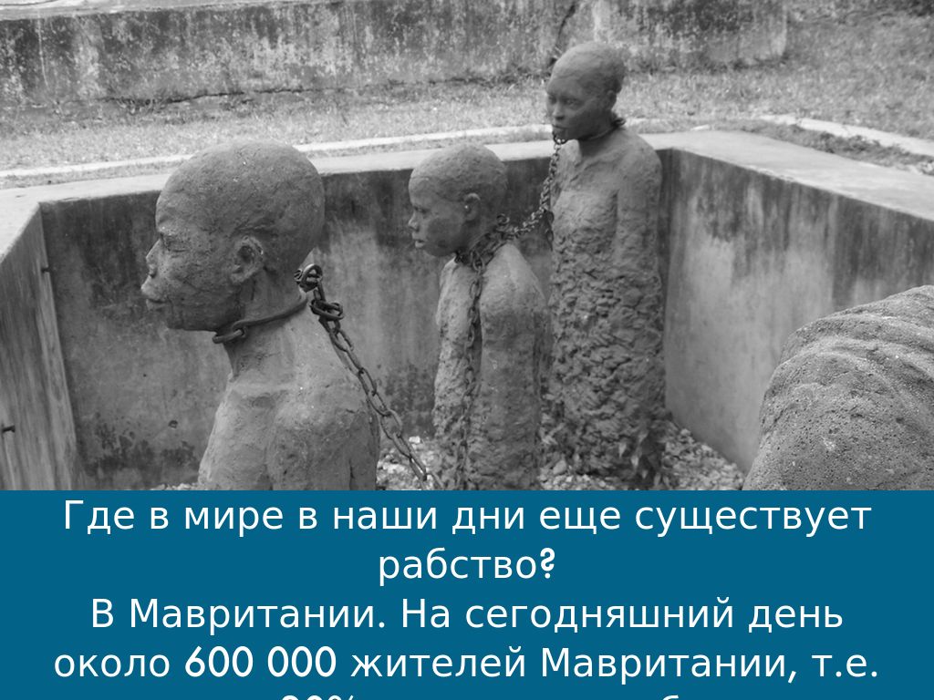 Где в мире в наши дни еще существует рабство? В Мавритании. На сегодняшний день около 600 000 жителей Мавритании, т.е. ок. 20% населения, рабы.