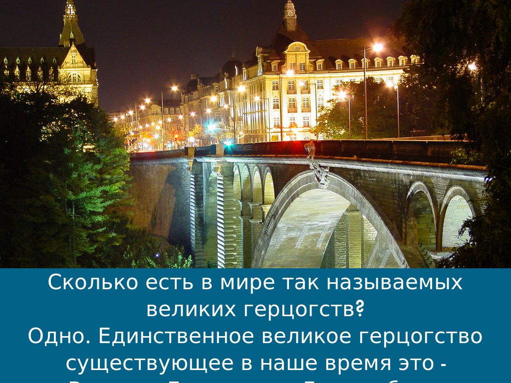 Сколько есть в мире так называемых великих герцогств? Одно. Единственное великое герцогство существующее в наше время это - Великое Герцогство Люксембург.