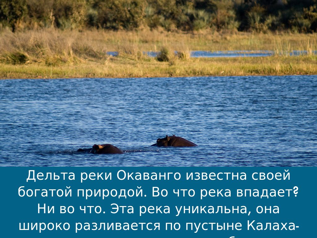 Дельта реки Окаванго известна своей богатой природой. Во что река впадает? Ни во что. Эта река уникальна, она широко разливается по пустыне Калахари, и создает одну из самых больших речных дельт в мире.