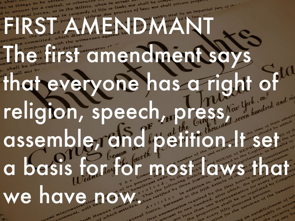 The first amendment says that everyone has a right of religion, speech, press, assemble, and petition.It set a basis for for most laws that we have now.