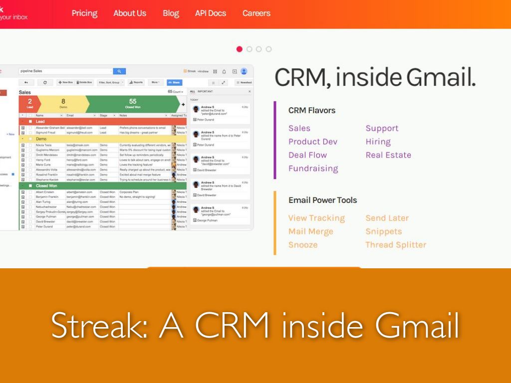 Streak is a basic CRM integrated with Gmail. In concept, it’s similar to Trello, except it lives inside Gmail, which makes it ideal for projects that involve a lot of e-mail communication.
