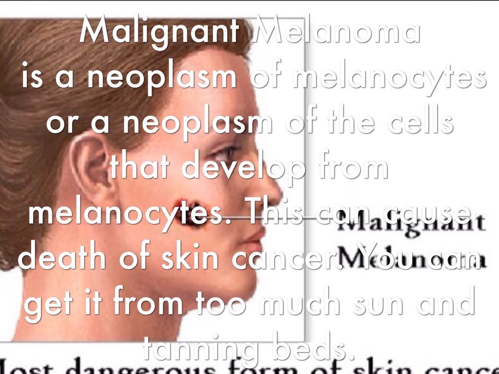is a neoplasm of melanocytes or a neoplasm of the cells that develop from melanocytes. This can cause death of skin cancer. You can get it from too much sun and tanning beds.
