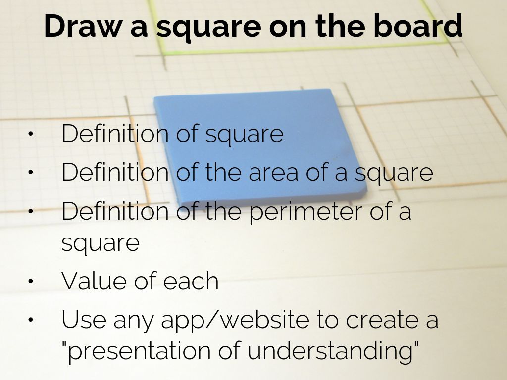 Draw a square on the board but do not put any dimensions on the square. Ask them to produce a "presentation of understanding" that contains all the information you have requested. Let them use any app they want. Some might just type up the information. Some might draw a square with labels describing everything you have asked for. Others might create a voiceover or video, verbally describing their findings.